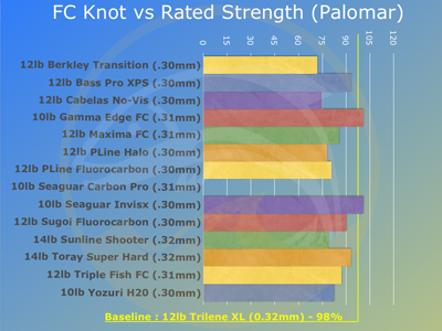 KS vs Rated Strength: Comparing knot strength to actual, rated strength with our Trilene XL reveals a 98% value. Using this comparison with our entire test lot, revealed only five out of our fourteen test subjects recorded average breaking strengths of ninety percent or more. In fact, two recorded values below 80%. One of our lines, Seaguar Carbon Pro, was absent from this test all together as we ran out of line by the time we reached this segment of our tests.