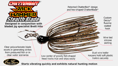 JackHammer 2.0 : Long considered the gold standard by which all bladed jigs are measured, the Evergreen International, Z-Man collaborative JackHammer is a tough bladed jig to beat. Never a company to rest on their laurels, Z-Man changes things up with JackHammer 2.0 by taking suggestions from Brett Hite and going to a StealthBlade made of a clear polycarbonate. Viewed as a more finesse alternative, JackHammer 2.0 was developed with clear water, smallmouth lakes in mind as well as largemouth waters that are highly pressured. MSRP is set for $15.99 with availability expected in August.