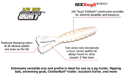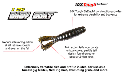 GOAT : Designed to compliment their ChatterBait suite of bladed jigs, Z-Man debuts a new soft plastic they think has the potential to be so good, they've dubbed it the GOAT. This new creature bait by Z-Man can be fished as a trailer, Texas rigged, Ned Rigged, flipping bait and more.