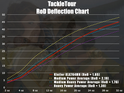 Fig 1 : The chart above illustrates the deflection characteristics of our Kistler KLX764MH against the historical averages of similarly powered rods we've tested over the past twenty years