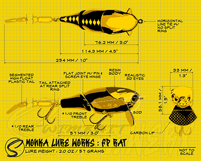 Bait Detail : A feature and dimension breakdown of the Monka Lure Works FP Rat as detailed by our Swimbait SkunkWerx division