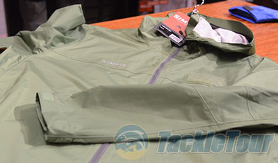 Contender Gore Tex Jacket:   This jacket provides complete water and wind protection and is guaranteed by Simms to keep you dry.  Utilizing a 3 layer Gore Tex shell and a 100% Polyester face, it will withstand the elements.  Cuffs are watertight and adjustable, and the large hood has a 3 point cinch that can fit over a mask or helmet securely.  The jacket also features 2 zippered chest and hand pockets, and a full length water resistant zipper.    Sleeves are designed to provide totally unhindered casting.  Sizes range from Small to XXL with 3 colors available:  Catch Camo/Dark Gunmetal, Catch Camo/Orange, and Dark Gunmetal.  Look for these to cost $349.95.