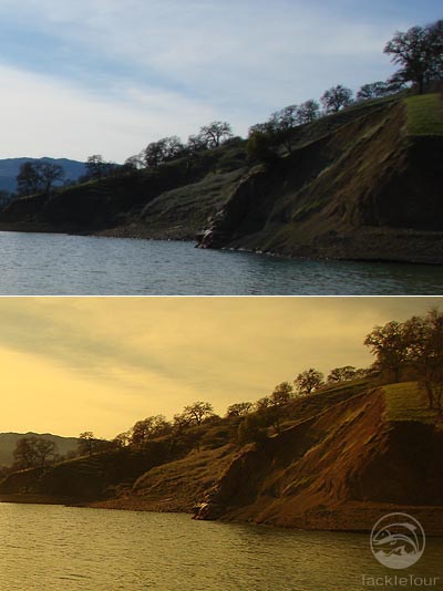 same landscape both alone and through the polarized lens shield. Notice how it