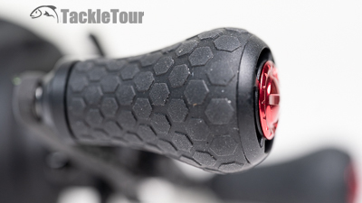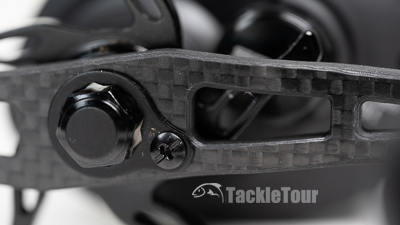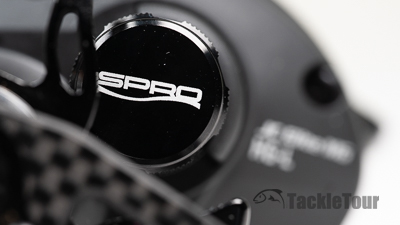 The reel is outfitted with a nice, comfortable one hundred millimeter (100mm) handle made of carbon fiber for an enthusiast level touch, but the its overall, black/dark gray motif is definitely more stealth than flashy. In fact, the only bit of color on this reel are the coded knob caps and rotor which you can't see unless you remove the non-handle sideplate. Even SPRO's logo on the spool tension knob lacks the usual swipe of green.
