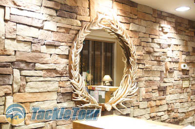 This mirror adorned with antlers sits behind the main desk.