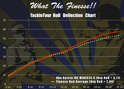 Fig 1 : The chart above illustrates the deflection characteristics of our Abu Garcia IKE Finesse Series MIKES74-4 against the averages of our finesse rods over the past decade