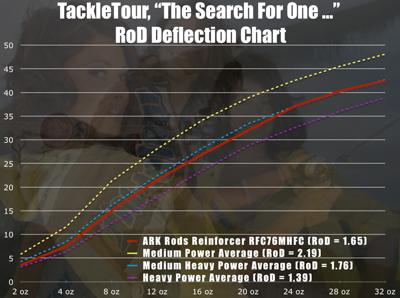 Fig 1 : The chart above illustrates the deflection characteristics of our ARK Rods RFC76MHFC Casting Rod against the averages of our general purpose rods separated by power