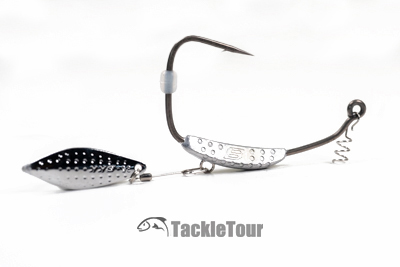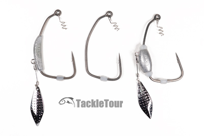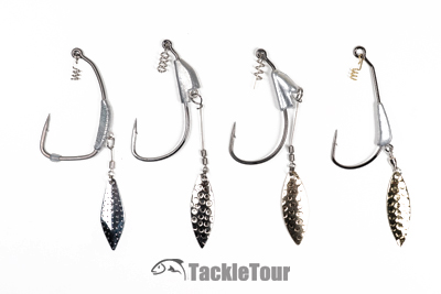 From left to right : BKK's Titan Driver, Gamakatsu's Spring Lock Spinner SB Hook, Owner's Flashy Swimmer, Zappu's Blading Pile Driver