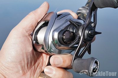 This is the first Zillion that I feel is really comfortable to fully wrap your fingers around the front of the reel when palming. There are no sharp angles on the reel, and the Magforce dial is positioned not only on the underside but away from the front of the reel so it doesn't become a hot-spot when gripping the reel tightly. Though the metallic surface is a little slick the shape of the indent on the face of the reel not only looks like the hood of a supercar but also provides a intuitive place to rest your thumb when palming.
