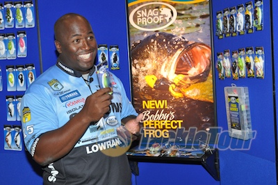 Introduction: The first thing Ish Monroe asked us when we caught up with him at the Snag Proof Booth was, “where’s Ms. Casey?”. To say he is a fan would be an understatement, but what excites bass pro more than the potential of meeting one of the TT Girls is talking about his new bait. What might that bait be you ask? Introducing Ish’s Phat Frog by Snag Proof.