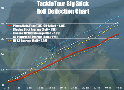 Fig 1 : The chart above illustrates the deflection characteristics of our Phenix Rods Titan Long Fall TJXL710H-B build against the historical averages for swimbait rods we've tested to date
